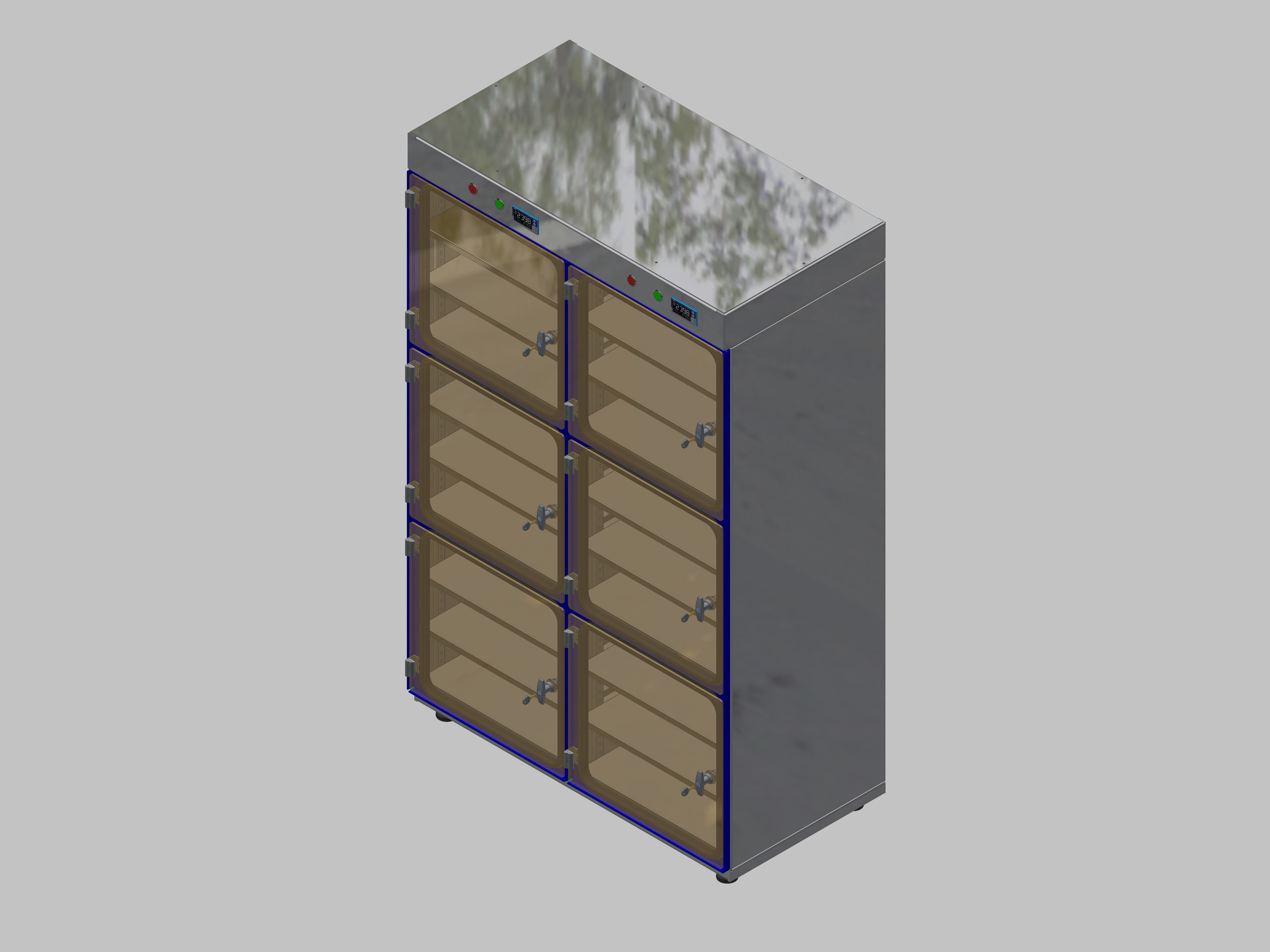Trockenlagerschrank-ITN-1200-6 mit 3 Fachböden pro Kompartiment und Sockelauführung unterfahrbar mit Stellfüssen, Regelung der Schrankatmosphäre pro Vertikalkompartiment