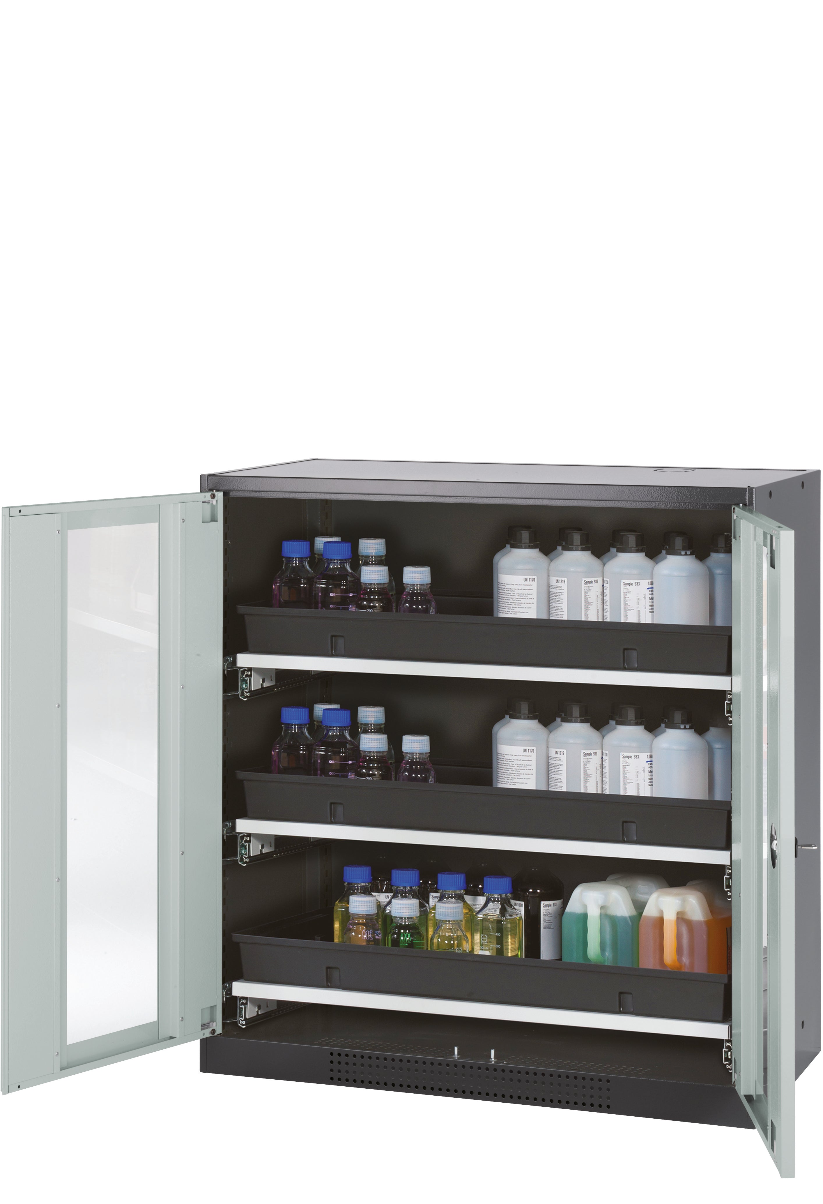 Chemikalienschrank CS-CLASSIC-G Modell CS.110.105.WDFW in lichtgrau RAL 7035 mit 3x Tablarauszug AbZ (Stahlblech/Polypropylen)