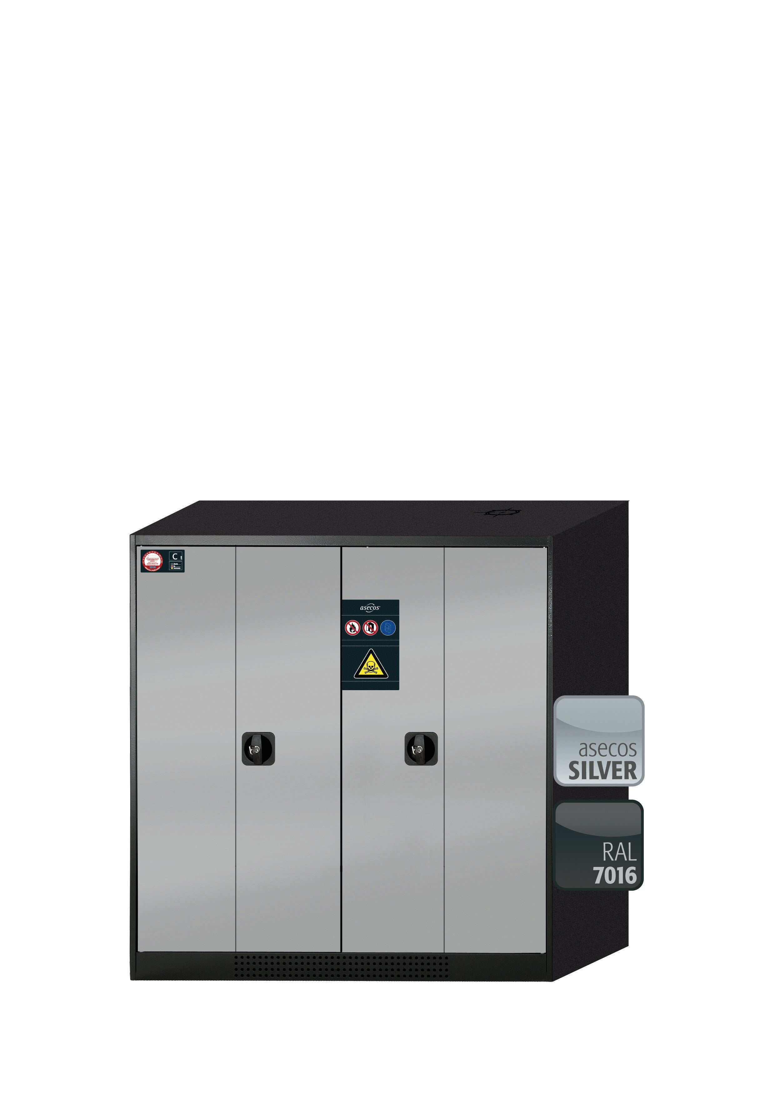 Chemikalienschrank CS-PHOENIX Modell CS.110.105.FD in asecos Silber mit 2x Fachboden Standard (Stahlblech)