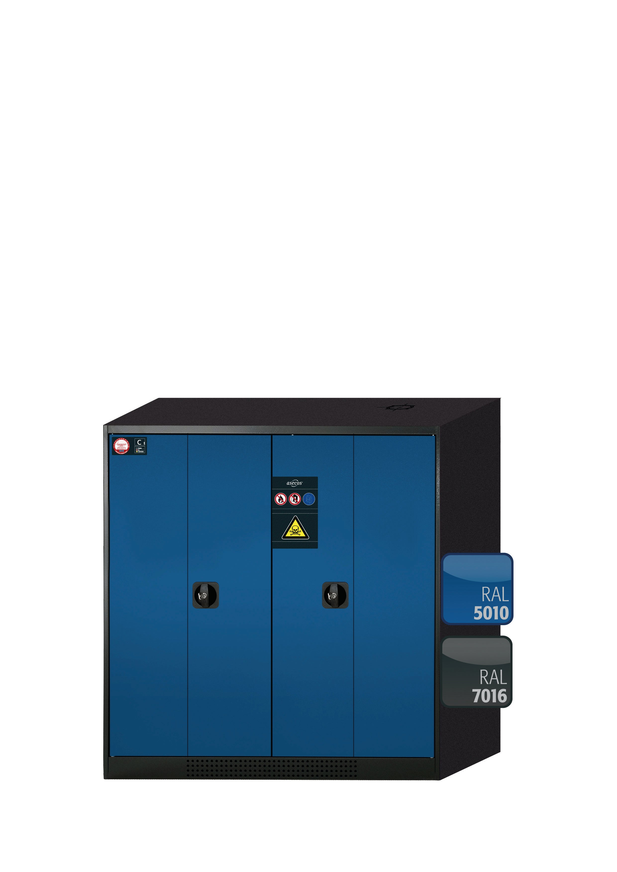 Chemikalienschrank CS-PHOENIX Modell CS.110.105.FD in enzianblau RAL 5010 mit 2x Fachboden Standard (Stahlblech)